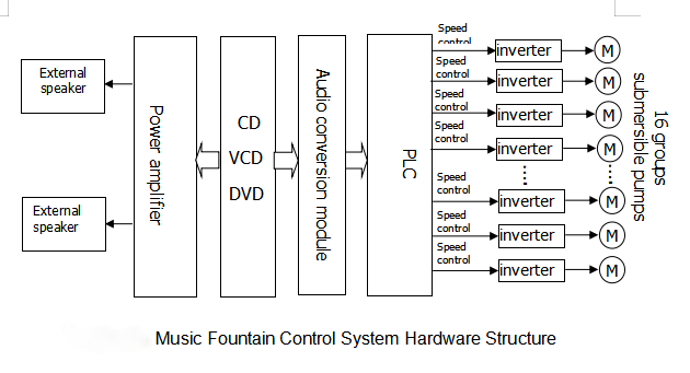 For different music, the jumps and swings of the water type synchronize with the music rhythm, showing the passion and vitality of the musical fountain. These jumps and swings are represented by corresponding programs after the audio converter acquires and converts the audio signal. The frequency converter controls the acceleration and deceleration of the submersible pump to present different views for different music signals.