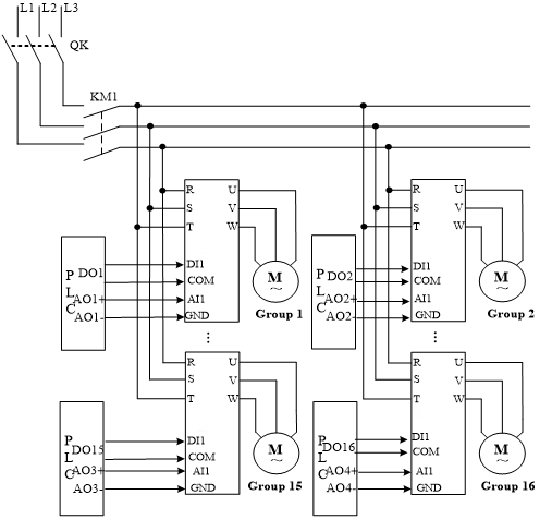 The main circuit diagram of the control system mainly includes the inverter and submersible pumps. The power line of the frequency converter is directly connected to the three – phase AC power, with connections to terminals R, S, and T respectively. The output is to the submersible pump, which is connected to terminals U, V, and W. The control system’s inverter in the circuit has rich protection functions, effectively protecting the system’s stable operation. The frequency changer DI1 is controlled by the PLC’s DO output for start – stop, and AI1 is given the PLC’s analog frequency. Different analog signal outputs change the speed of the submersible pump. The specific circuit diagram of the control system is shown in Figure 3.1.
