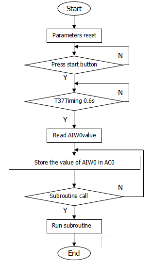 As shown in Figure 4.1, when the PLC runs, it starts parameter initialization and scans the system program. When the start button is pressed, the system main program does the following: start timing, read the value in AIW0 every s. The stored value goes to the accumulator AC0. AC0 is compared with the internal set value to determine which subroutine to call. After selection, the subroutine runs and the routine ends.